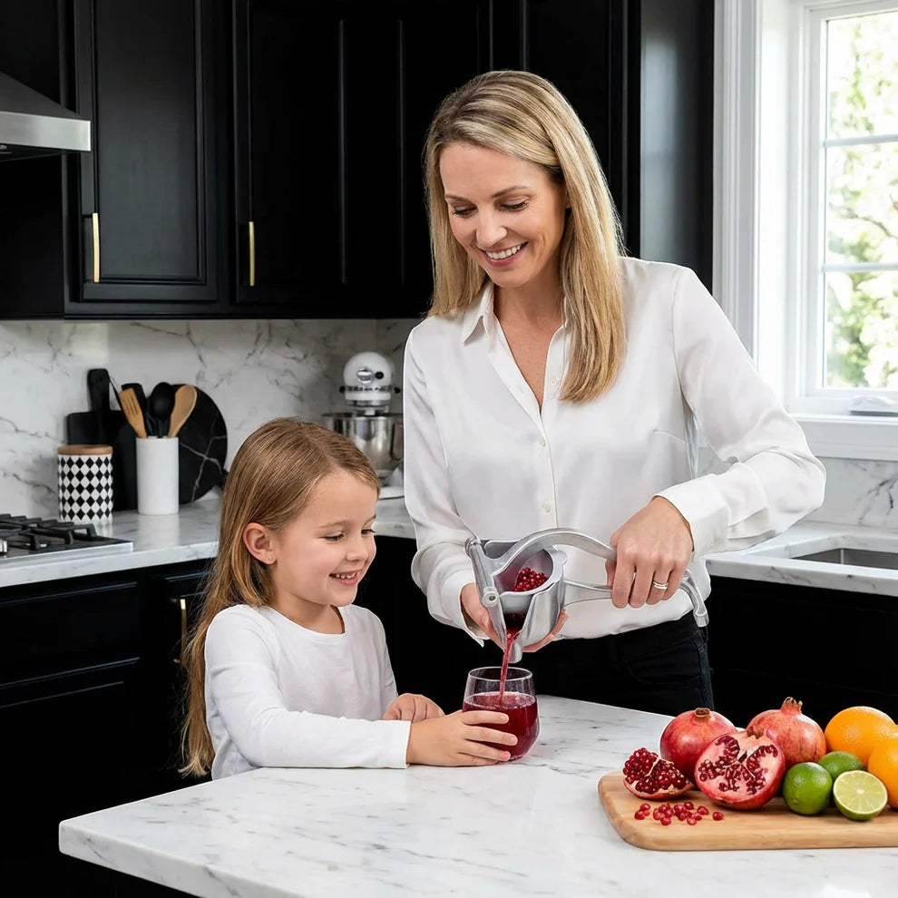 Der Aluminium-Handentsafter ist die ideale Lösung, um Zitrusfrüchte schnell, sauber und effizient auszupressen. Dank der stabilen Aluminiumkonstruktion und der ergonomischen Hebelmechanik lassen sich Orangen, Zitronen, Limetten oder Granatäpfel mit minimalem Kraftaufwand entsaften – ganz ohne Strom.